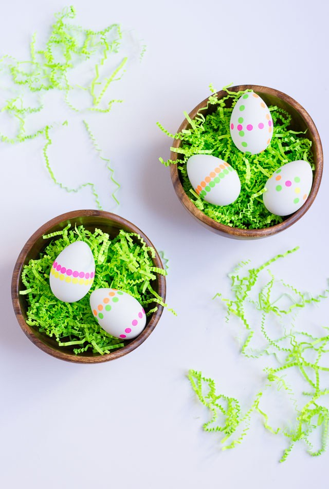 You just stick on the neon dot stickers to make all kinds of fun patterns. In minutes, your eggs are totally ready for Easter!