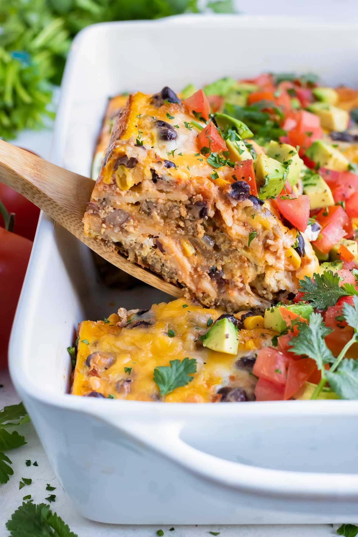 This casserole has a lot going for it, but one thing it is not is boring. The mix of black beans, fresh veggies, meat, and eggs is like having a breakfast burrito and a taco all in one glorious bake.