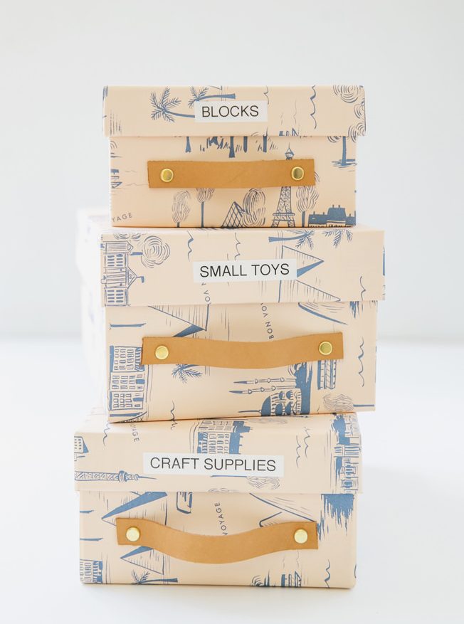 I’m always looking for new toy storage ideas! Just cover a shoebox with some lovely paper and add handles for a super organized storage solution.