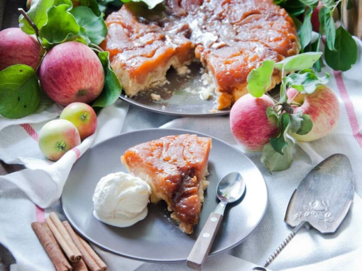 A tarte tatin is a French upside-down tart made with pastry, butter, sugar, and apples. This version makes things way easier by using store-bought puff pastry.