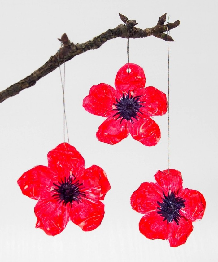 Poppies are the flower of remembrance in Australia and other Commonwealth nations. You can use the bottoms of bottles to make this hanging poppy decoration.